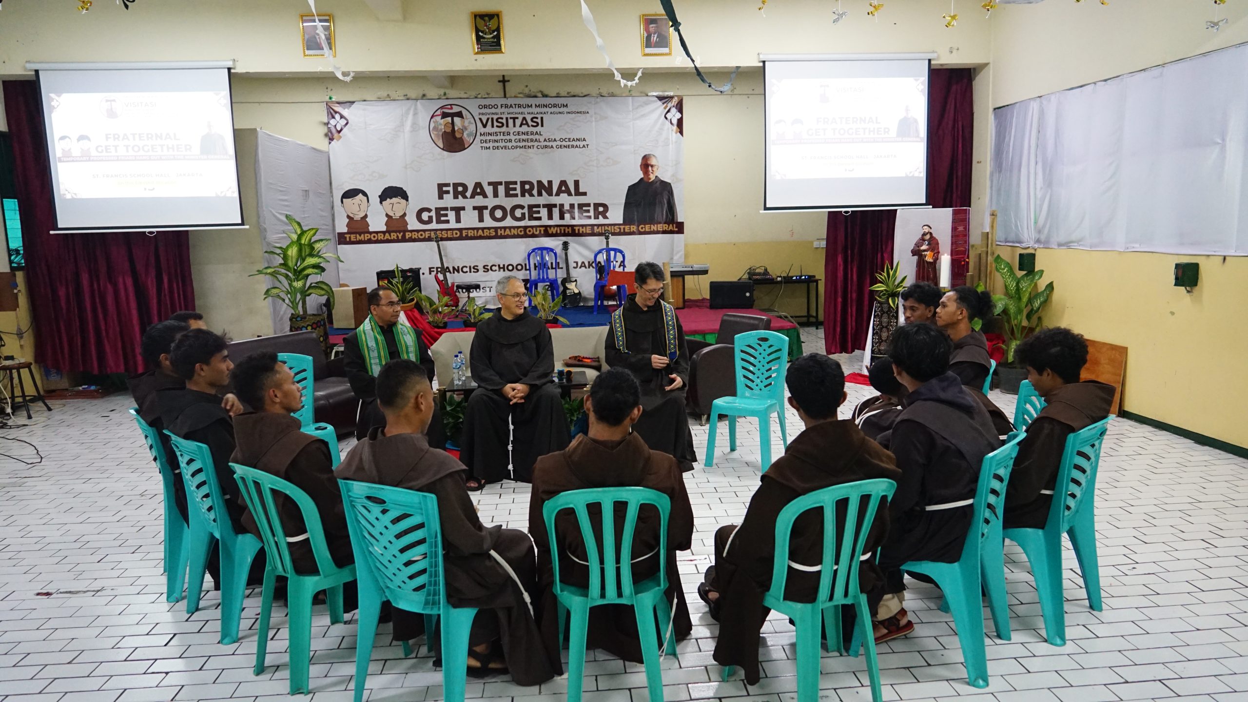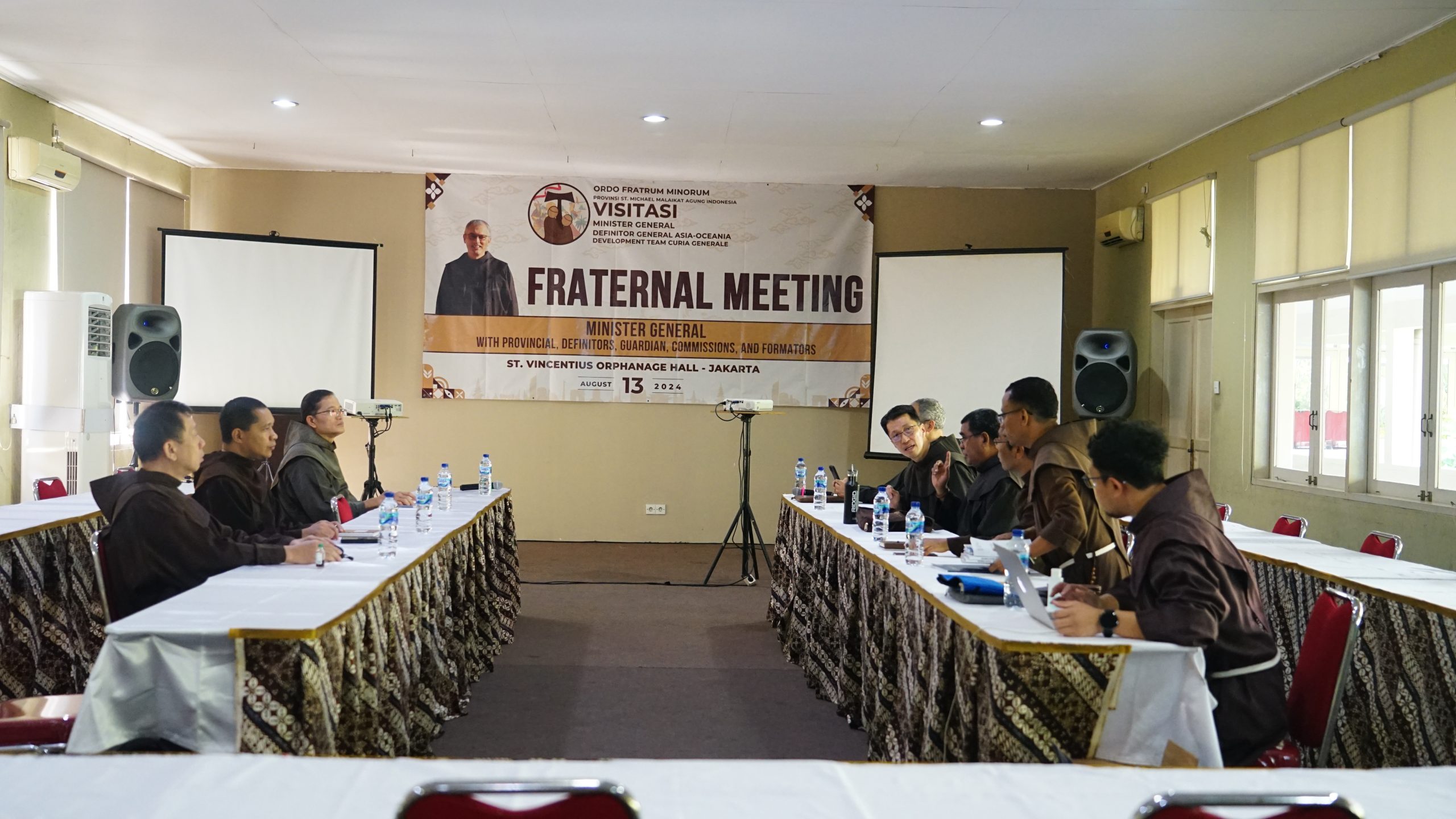 Jakarta, OFM – Visitasi Minister General di Jakarta pada Selasa (13/8/2024) diwarnai dengan sejumlah agenda pertemuan. Pertama, pada pukul. 09.00 WIB, bertempat di Ruang Bakat-Minat Panti Asuhan Vincentius Putera, Kramat, Sdr. Massimo bersama Sdr. John Wong OFM dan Sdr. Baptist D’sousa OFM mengadakan pertemuan terbatas dengan Minister Provinsi, Vikaris, serta anggota definitorium. Pada pertemuan ini, para anggota definitorium memberikan gambaran singkat terkait tugas dan peran masing-masing termasuk peran dewan-dewan dan komisi-komisi dalam Persaudaraan OFM Indonesia. Hal lain yang disampaikan dalam pertemuan ini adalah implementasi hasil Kapitel Provinsi, roadmap setiap gardianat, monitoring dan evaluasi, serta berbagai kegiatan animasi yang dilakukan oleh dewan dan komisi kepada para Saudara. Sebagai tanggapan, Sdr. Massimo memberikan apresiasi atas kerja sama anggota definitorium, dewan dan komisi-komisi, serta berbagai rencana kegiatan yang terencana dan tersusun rapih. Beliau juga memberi masukan untuk diperhatikan oleh persaudaraan untuk, “meninjau kembali gardianat-gardianat sehingga dapat sesuai dengan Konstitusi Umum di mana setidaknya setiap gardianat memiliki tiga Saudara Dina berprofesi kekal.”