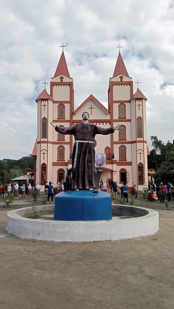 Tampak depan gereja baru dan patung St. Fransiskus Assisi sebagai pelindung paroki.