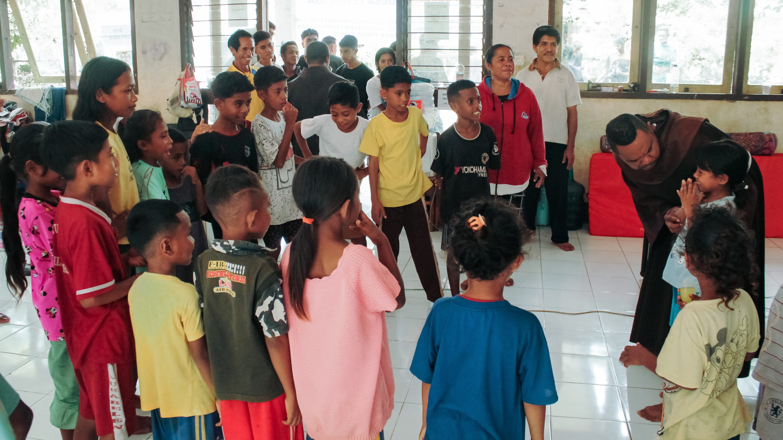 Sdr. Abba OFM bercengkerama dengan anak-anak. Pastoral ramah anak menjadi relevan dalam situasi seperti ini.