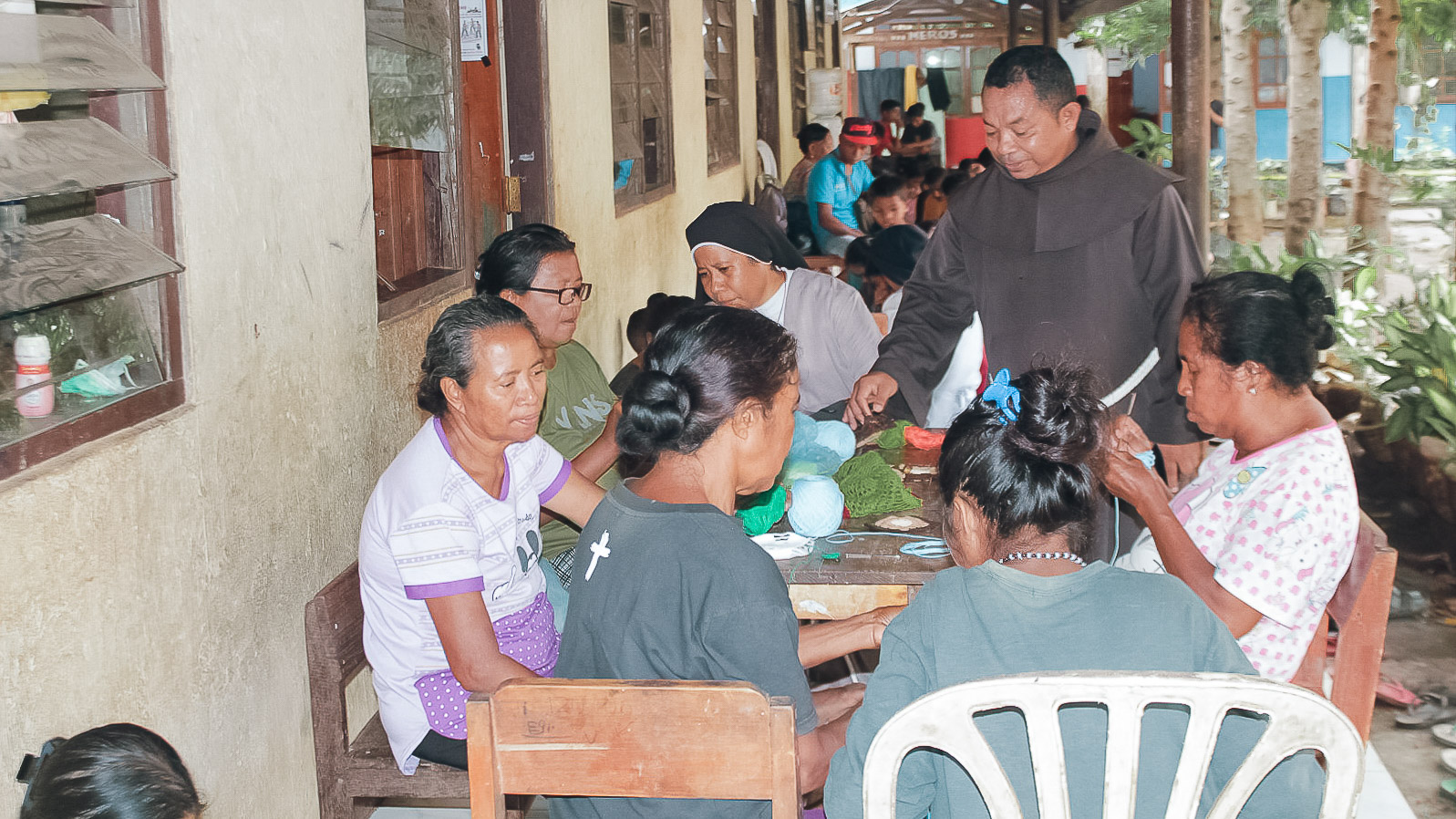 Selanjutnya, pada hari Senin (9/12), para pengungsi mulai mengikuti kegiatan skill upgrading. Didampingi para Saudara Dina dan Suster SFSC, para pengungsi — mulai dari anak-anak hingga orang tua — terlibat dalam kegiatan pelatihan pembuatan keset lantai, taplak meja, rosario, serta pangan lokal. Kegiatan pendampingan ini sekaligus menjadi cara mengisi waktu bagi para pengungsi.