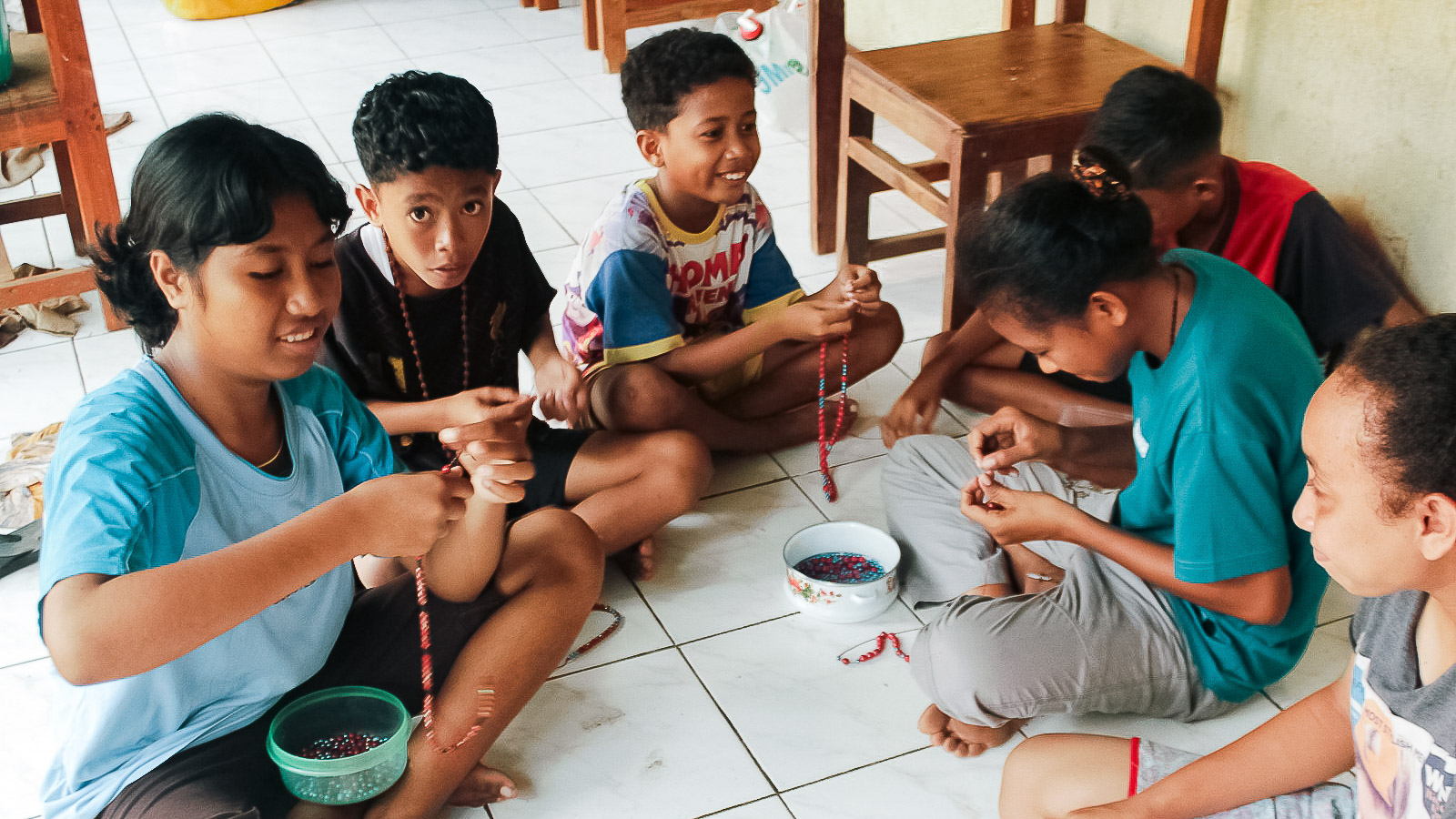 Anak-anak belajar membuat dan merangkai rosario. Bukan hanya melalui aneka permainan, kreativitas dan energi mereka juga dituangkan dalam aktivitas ini.