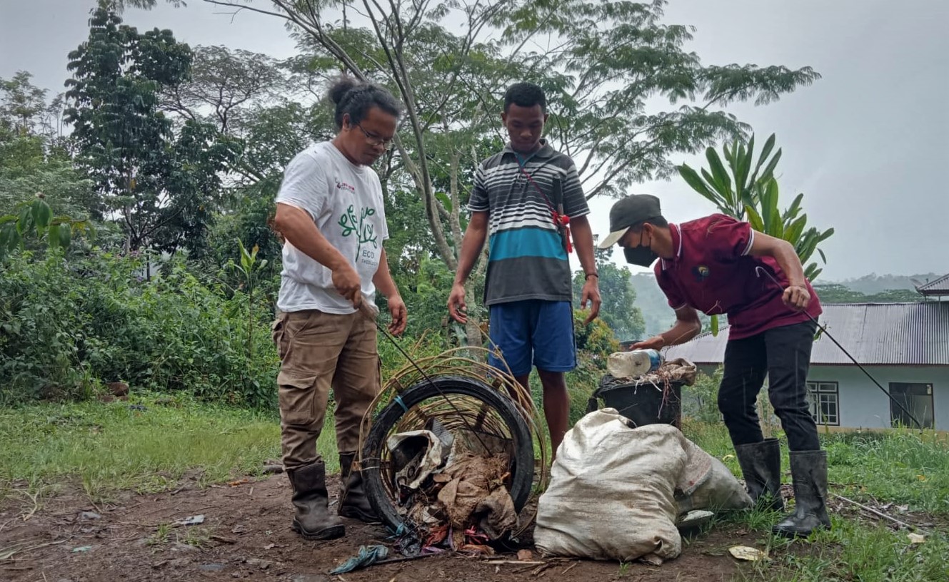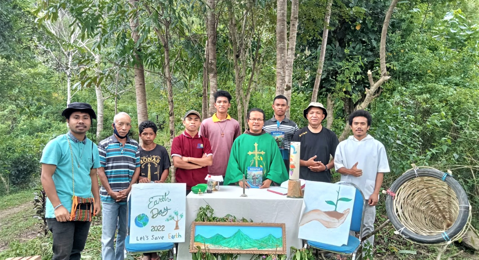 Sdr. Johny Dohut, OFM bersama tim ekopastoral dalam perayaan ekaristi memperingati Hari Bumi. Tampak capat (kanan) yang dipakai untuk menjebak sampah.